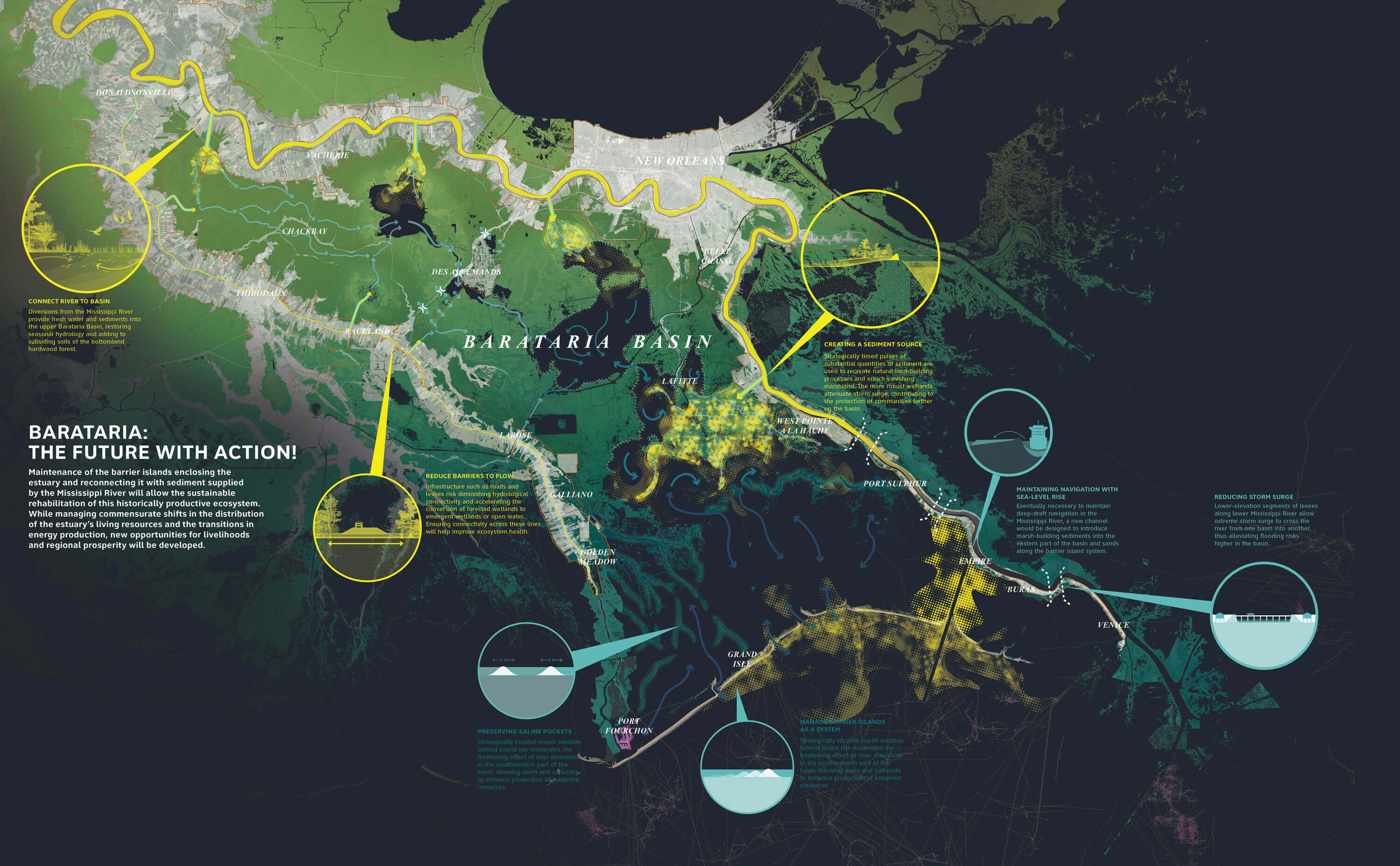 The Barataria Basin has played an essential role in the production of natural resources and shaping the rich history and development of Southeastern Louisiana and New Orleans. This basin's estuary serves as a bountiful host to some of Louisiana's oysters, shrimp and fish, feeding locals, visitors and the nation. Protecting this area is critical, and it starts with implementing sediment diversions and managing sediment retention. Projects are already underway in the Barataria Basin, including storm surge management systems, maintenance of barrier island system and efforts to rebuild marsh. Together, these projects will propel Barataria towards greater prductivity.